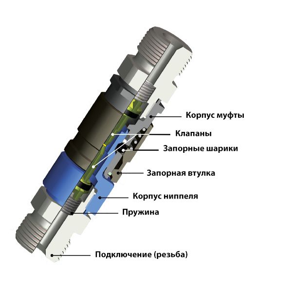 Муфта состоит из корпусной детали с отдельным соединителем, фиксатора и эластомерных уплотнителей. Корпус – это целостный элемент, используемый для соединений. Фиксатор в виде стопорной втулки, зажимных шариков или запорной пружины, обеспечивает механическое соединение, а уплотнители предотвращают утечку среды.