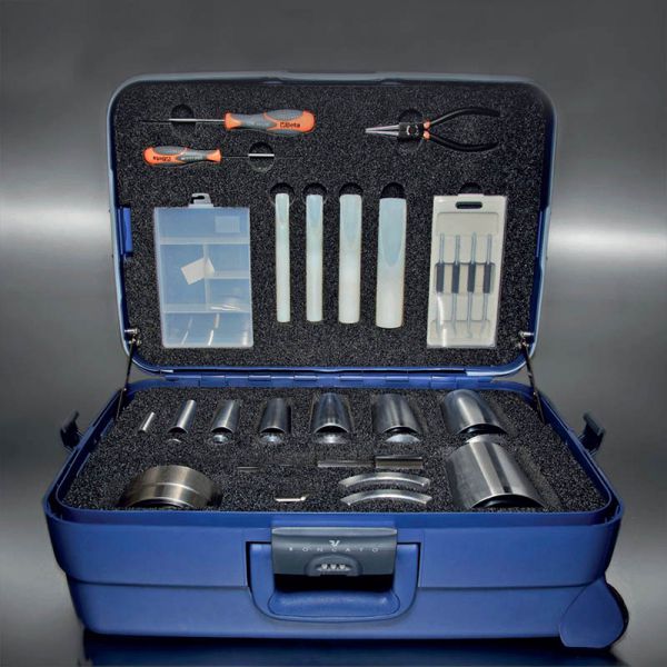 В нем можно найти все необходимое для ремонта гидроцилиндра – от стандартных отверток до специальных трубок для замены уплотнительных колец. В распоряжении мастера: наборы конусов для сборки уплотнения поршня, наборы прокладок для вышеуказанных конусов, наборы калибраторов для уплотнения поршня и штока, инструменты для удаления уплотнений, конусы для установки уплотнительных колец и так далее. Также в чемодане имеется удобный контейнер для мелких деталей.